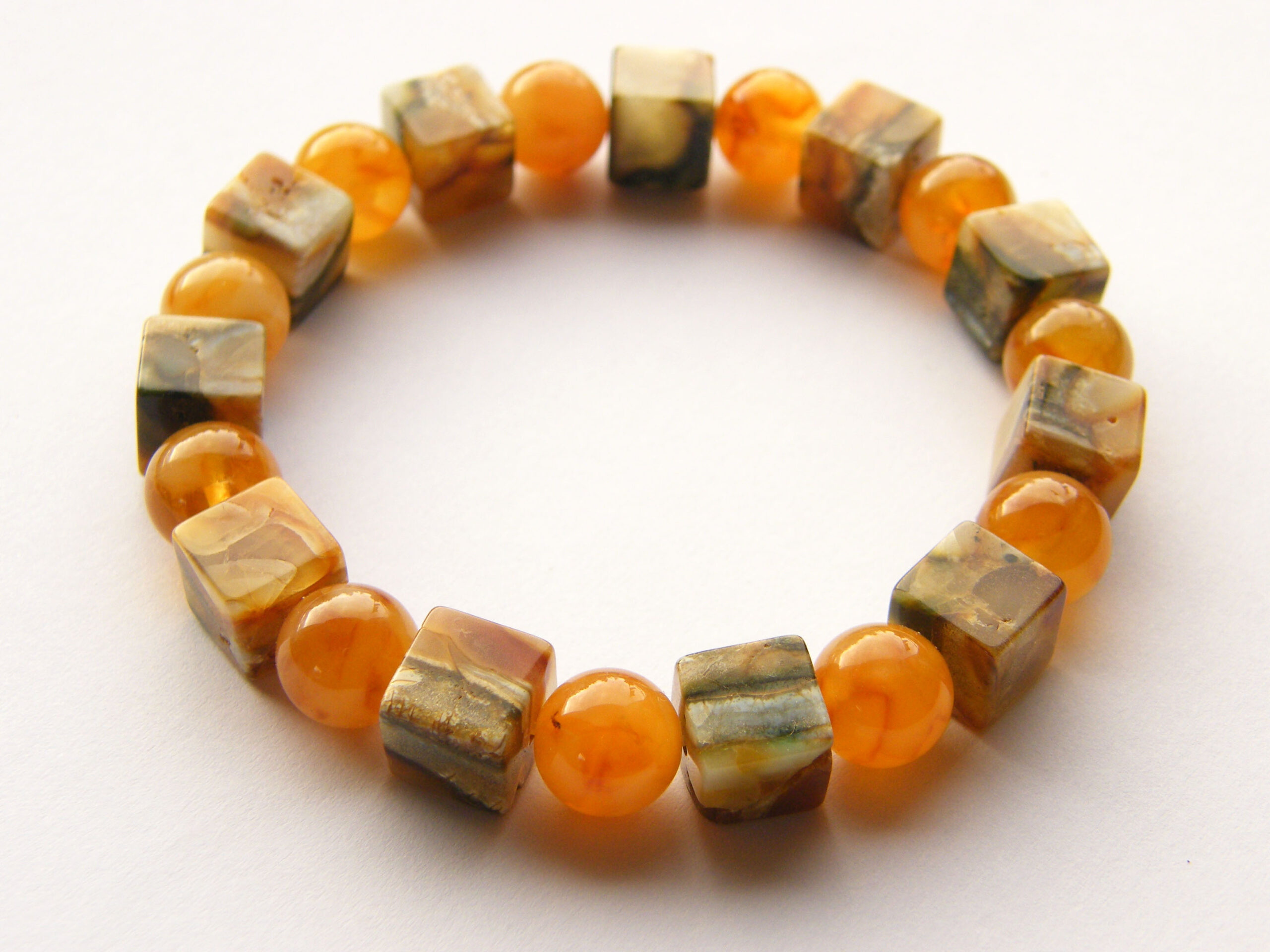 Bransoleta wykonana z jasnych kulek i kolorowych kostek bursztynowych, nanizanych na bezbarwną gumkę jubilerską, bez zapięcia.