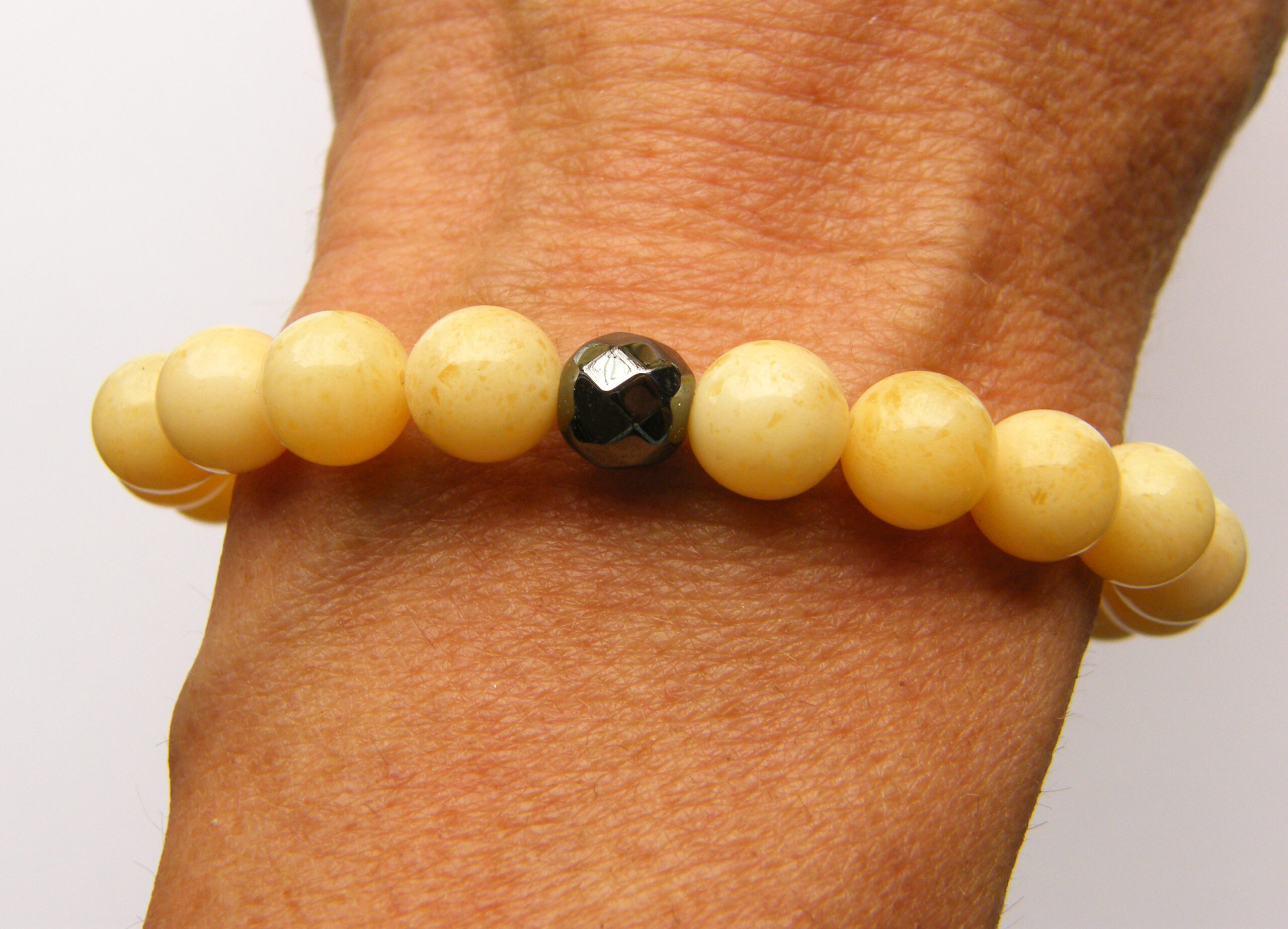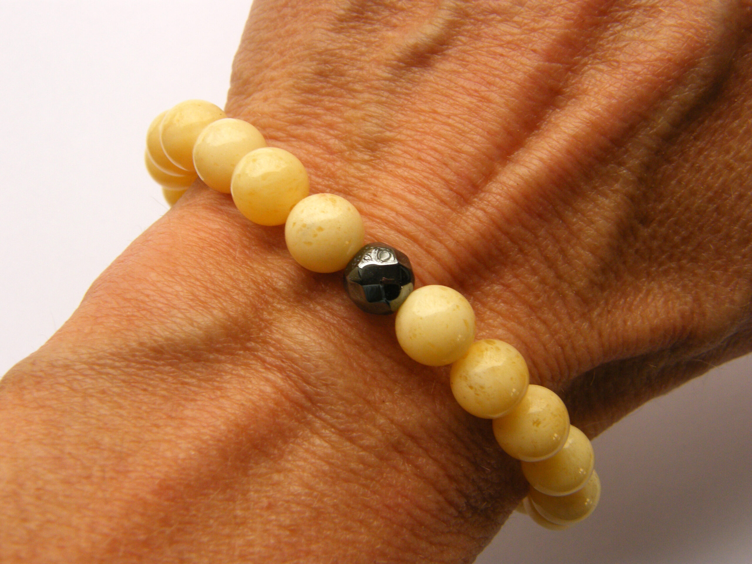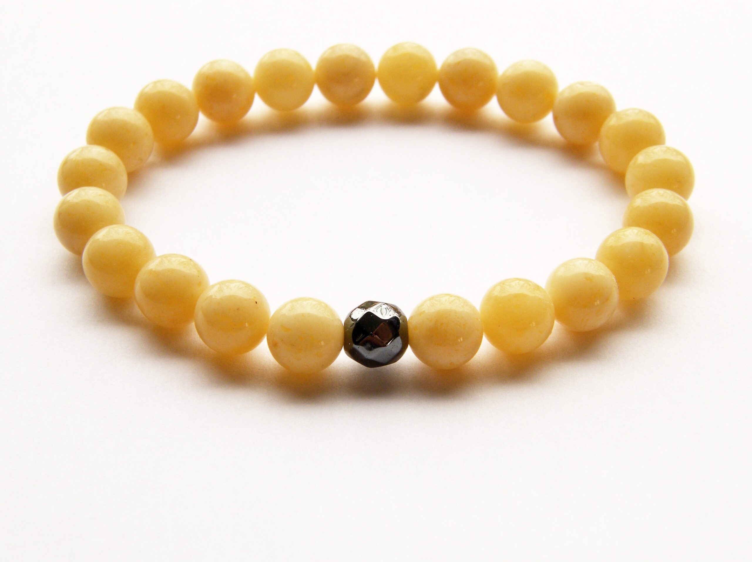 Bransoleta wykonana z jasnych bursztynowych kulek i fasetowanej kulki hematytu. Wszystko nanizane na bezbarwną gumkę jubilerską, bez zapięcia.