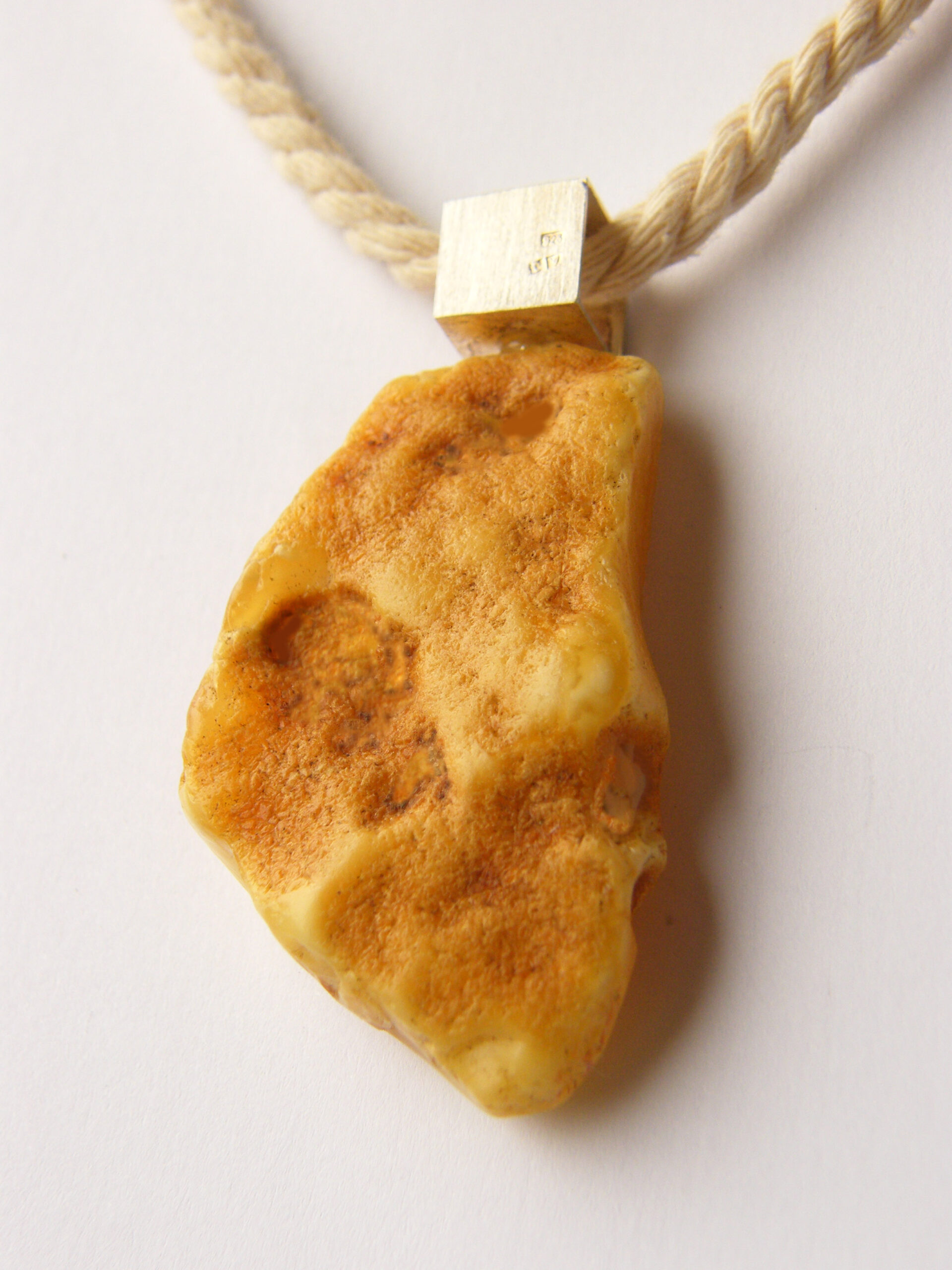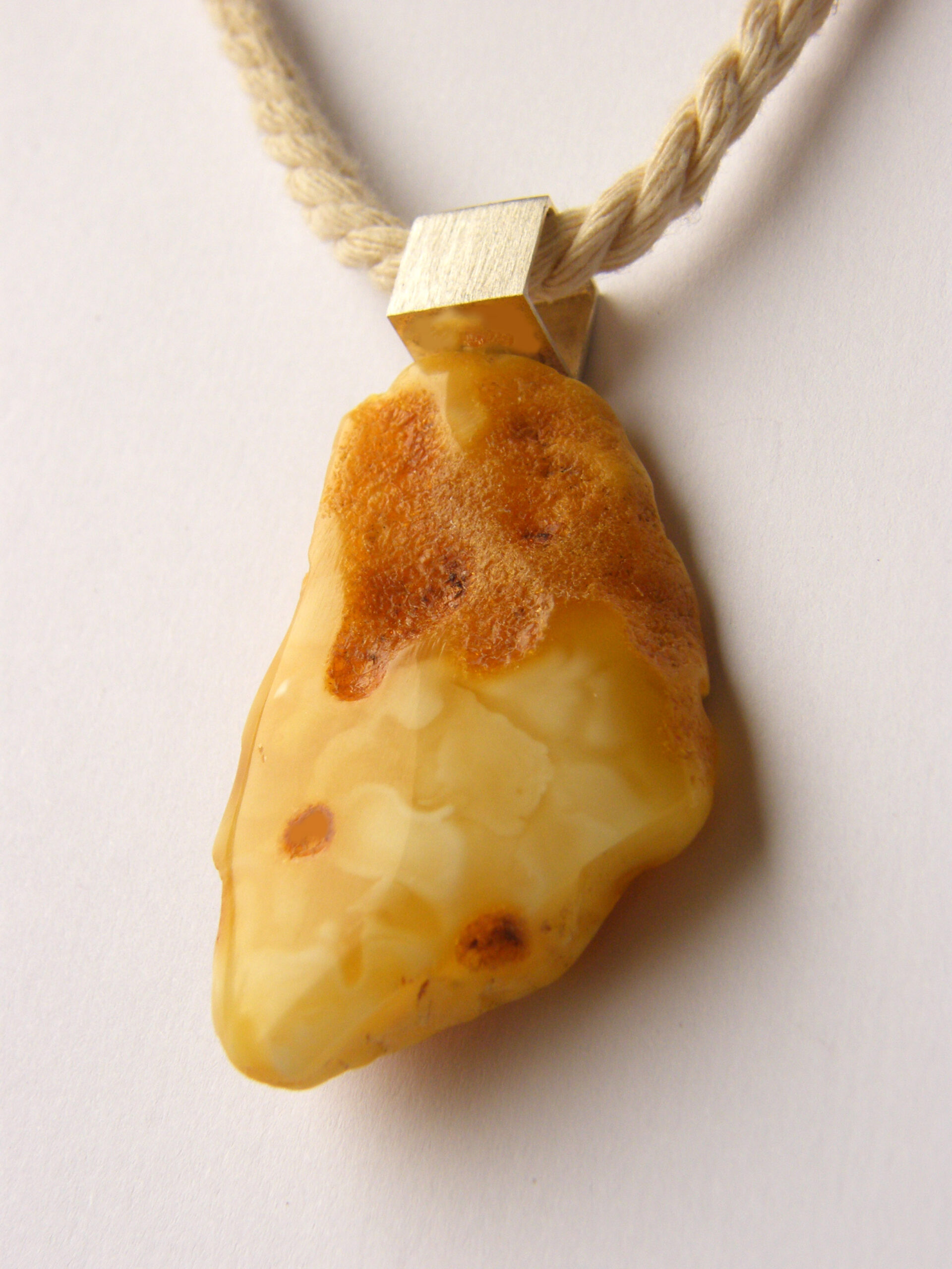 Wisior bursztynowy mleczny, z częściowo pozostawioną korą bursztynową, połączony ze srebrem (próba 925). Ręcznie wykonany.